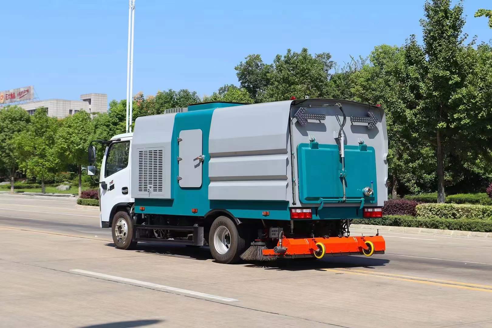 洗掃車:是掃路車的升級版本,在原有的掃路車的基本上加了高壓水泵之后,在掃盤旁邊加了高壓沖洗功能,經過沖洗的路面更加干凈,且還有?后噴霧,可以達到二次降塵的效果。