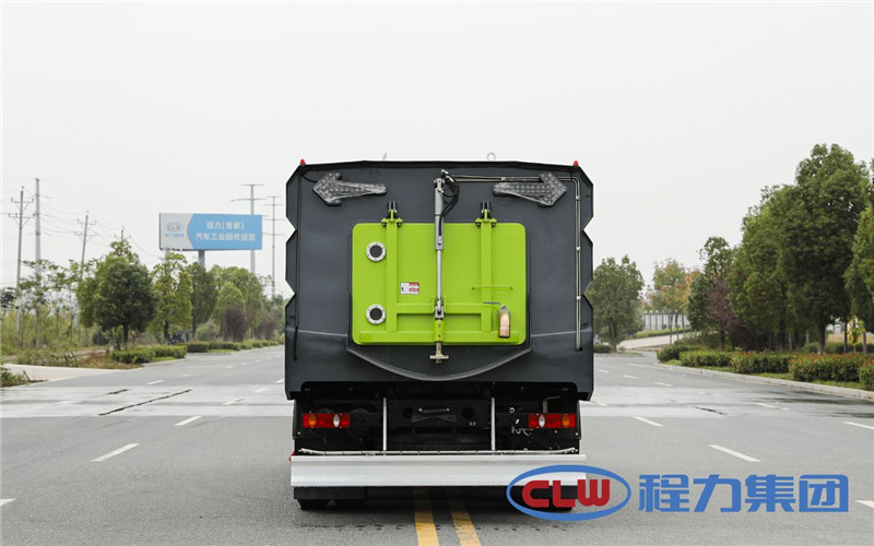 東風(fēng)天錦多功能洗掃車采用東風(fēng)天錦DFH1180EX8型國六二類汽車底盤改裝,加裝副發(fā)動機(jī)、風(fēng)機(jī)、高壓水泵、清水箱、垃圾箱、左右立掃、帶噴水桿的寬吸嘴、低壓沖洗系統(tǒng)、掃盤降塵系統(tǒng)、液壓系統(tǒng)、專用裝置電控系統(tǒng)和副車架等改裝而成。清水箱充分利用了車載空間,容積大,容積達(dá)9m3。垃圾箱采用單層304不銹鋼結(jié)構(gòu),傾翻卸料,帶高壓自潔裝置。自潔裝置可在垃圾箱卸料時幫助卸料,清洗垃圾箱內(nèi)部。
